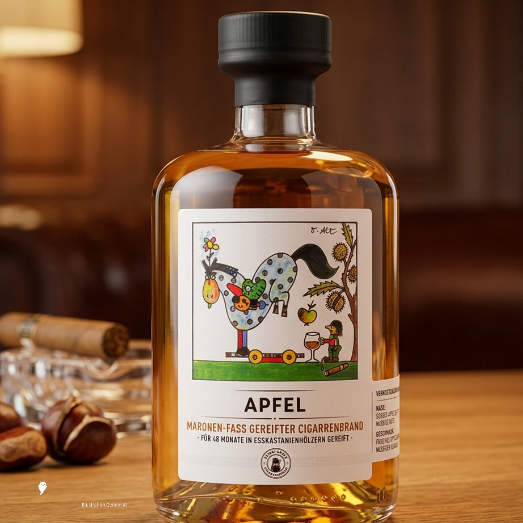 Edelbrand aus handverlesenen Äpfeln mit frischer Fruchtigkeit und eleganter Tiefe. Durch die 48-monatige Reifung im Maronenfass entwickelt er eine weiche, harmonische Struktur mit dezenten Holznoten und langem Abgang.