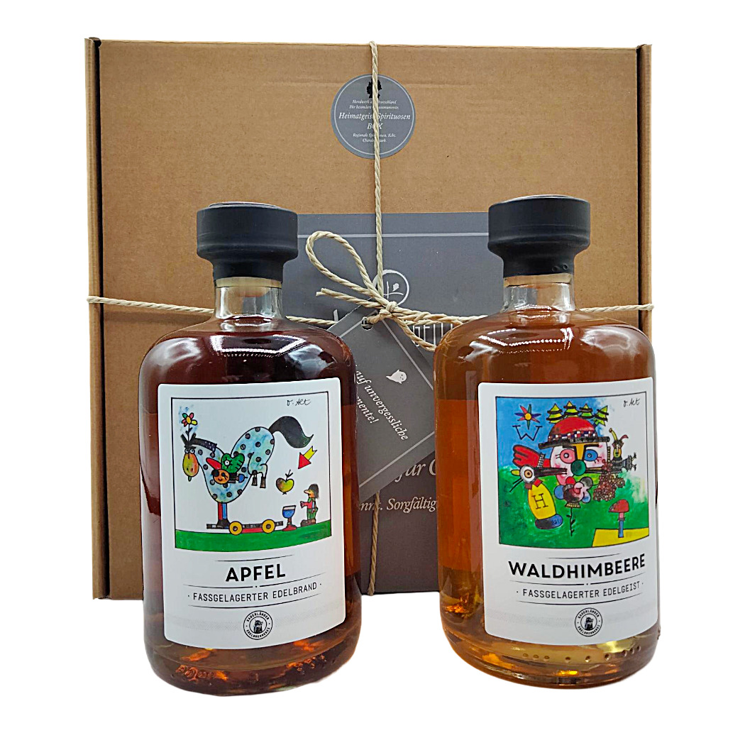 Geschenkkarton mit Apfelbrand & Waldhimbeergeist – 2 Spirituosen 0,50 l/Fl., 42%-Vol. |
